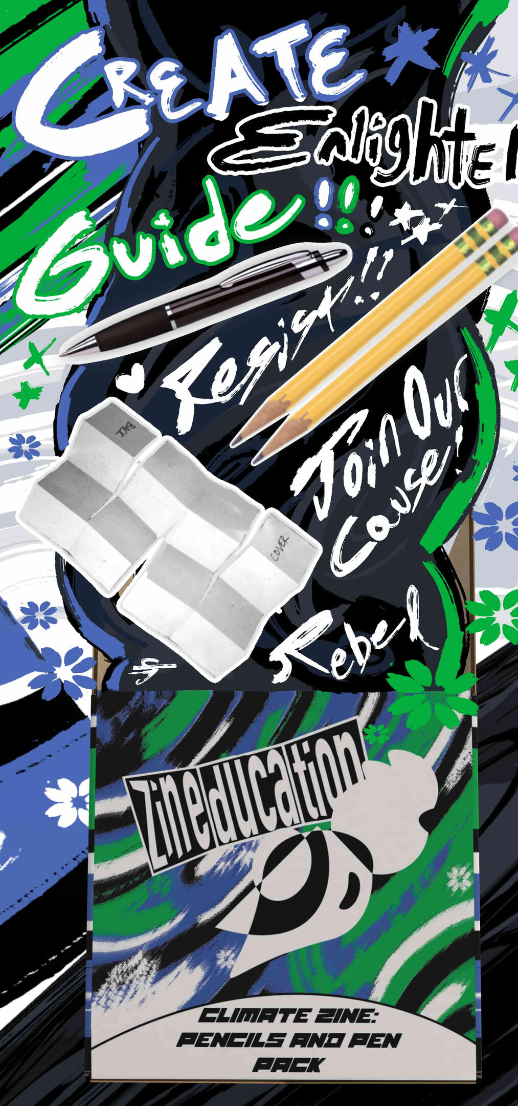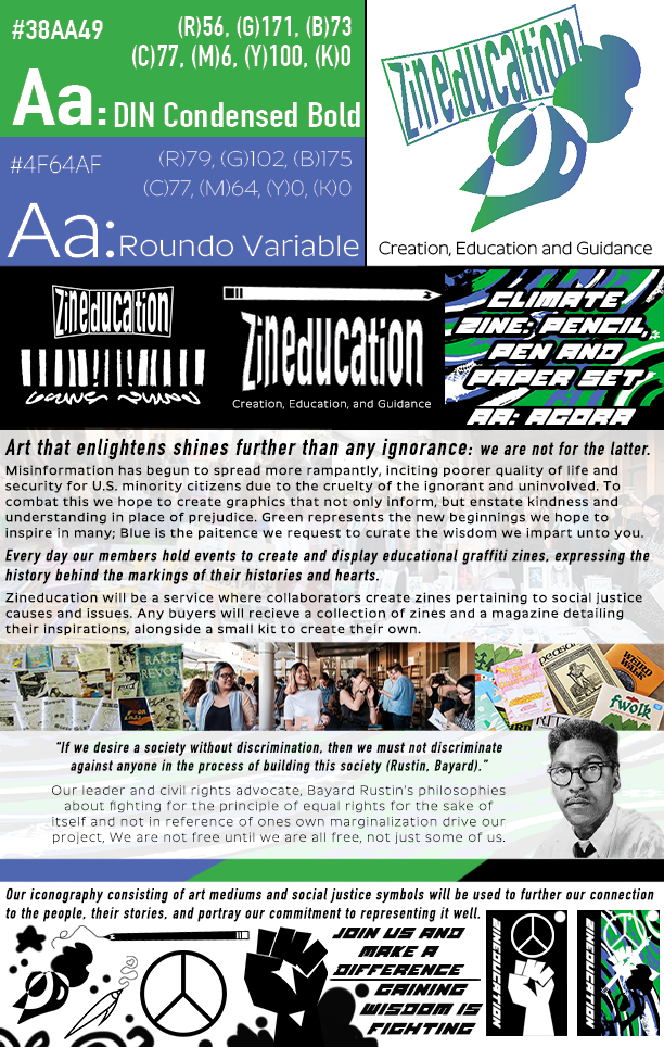 Zineducation Brand Synergy - I was assigned to build a company brand from scratch, designing everything from the logo, to typography, to brand guidelines, and to advertisements! I decided on a fake zine/ art tool distributor called "Zineducation," that made graffiti inspired zines for social and environmental justice causes! To fit in with that punk/rebellion theme, the branding elements are very sketchy and chaotic! Box Mockups were produced from Pacdora without using their AI.